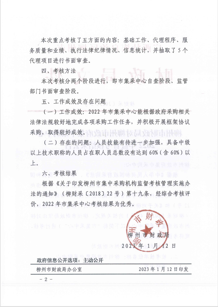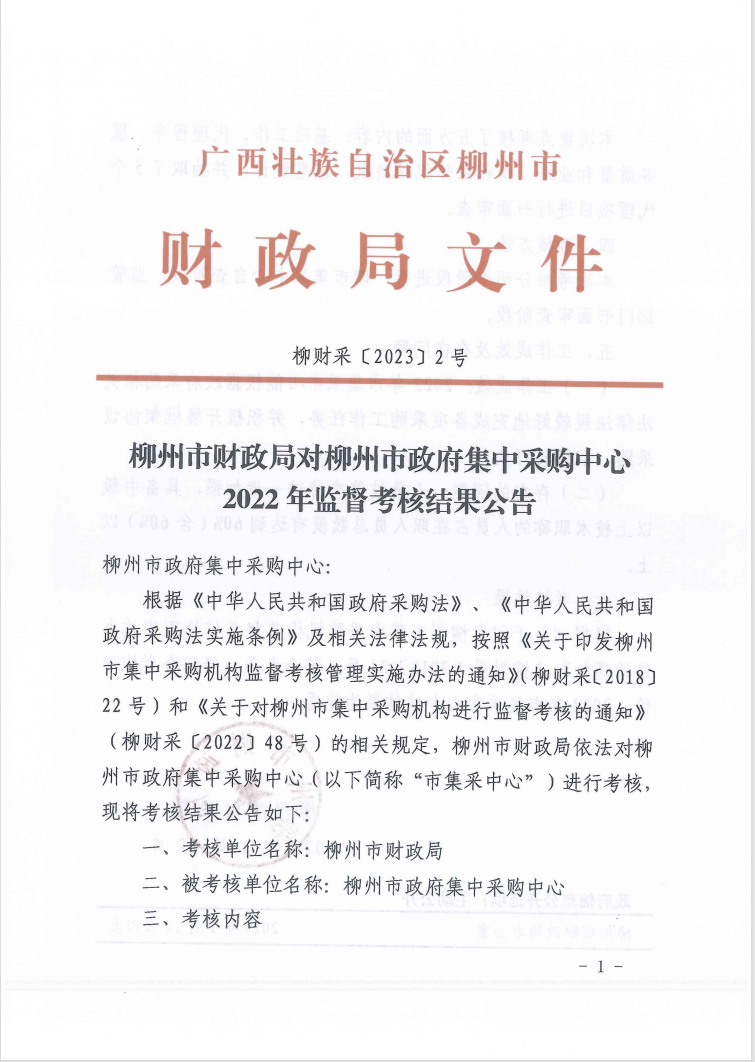 柳州市财政局对柳州市政府集中采购中心2022年监督考核结果公告(柳财采〔2023〕2号)
