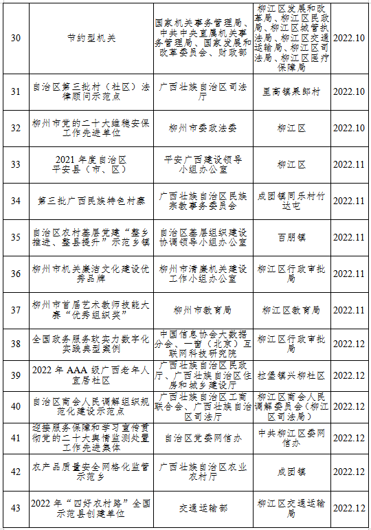 柳江区2022年荣获上级嘉奖表彰情况一览表