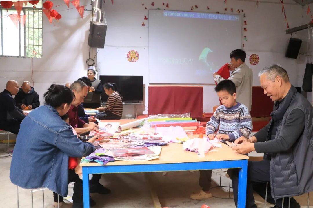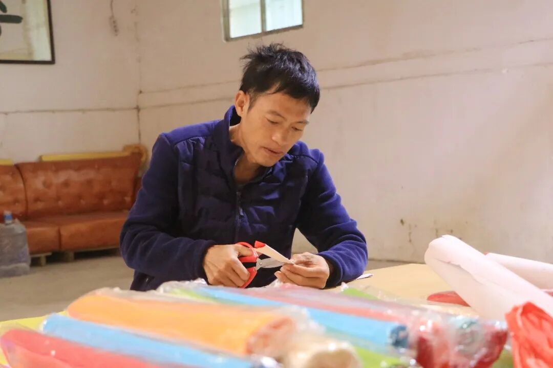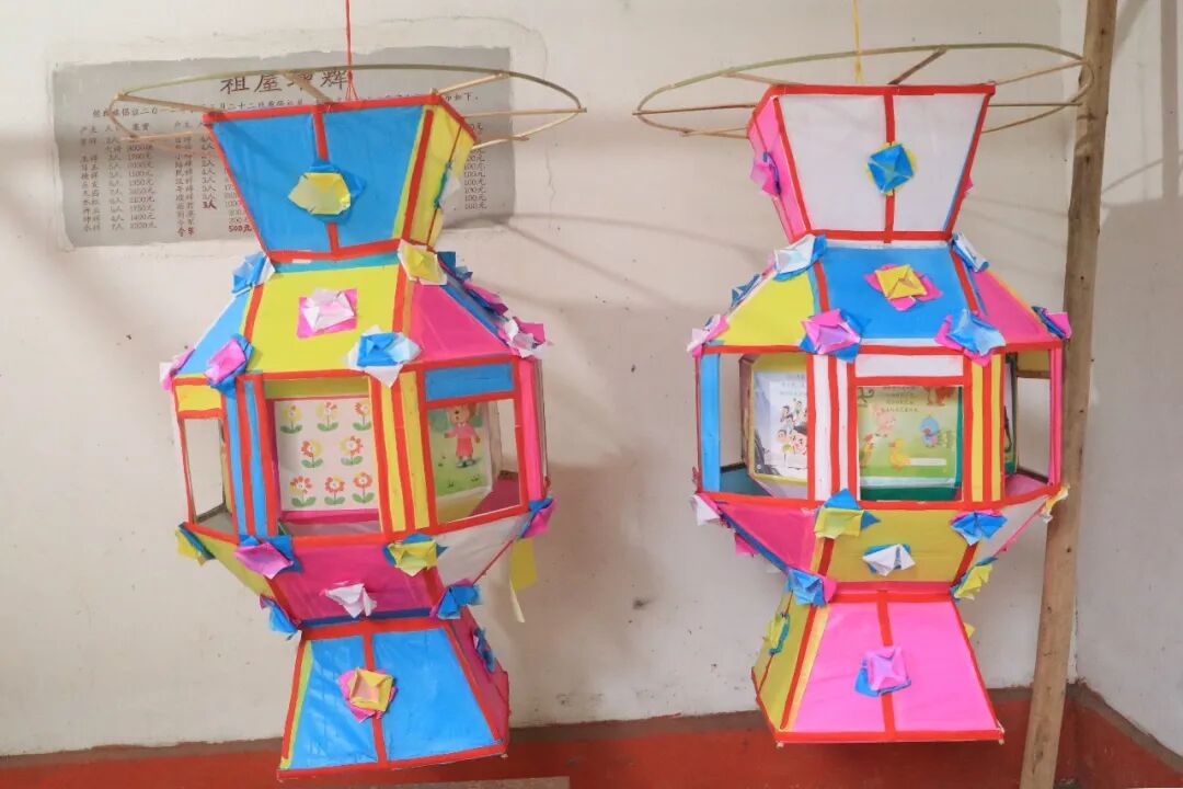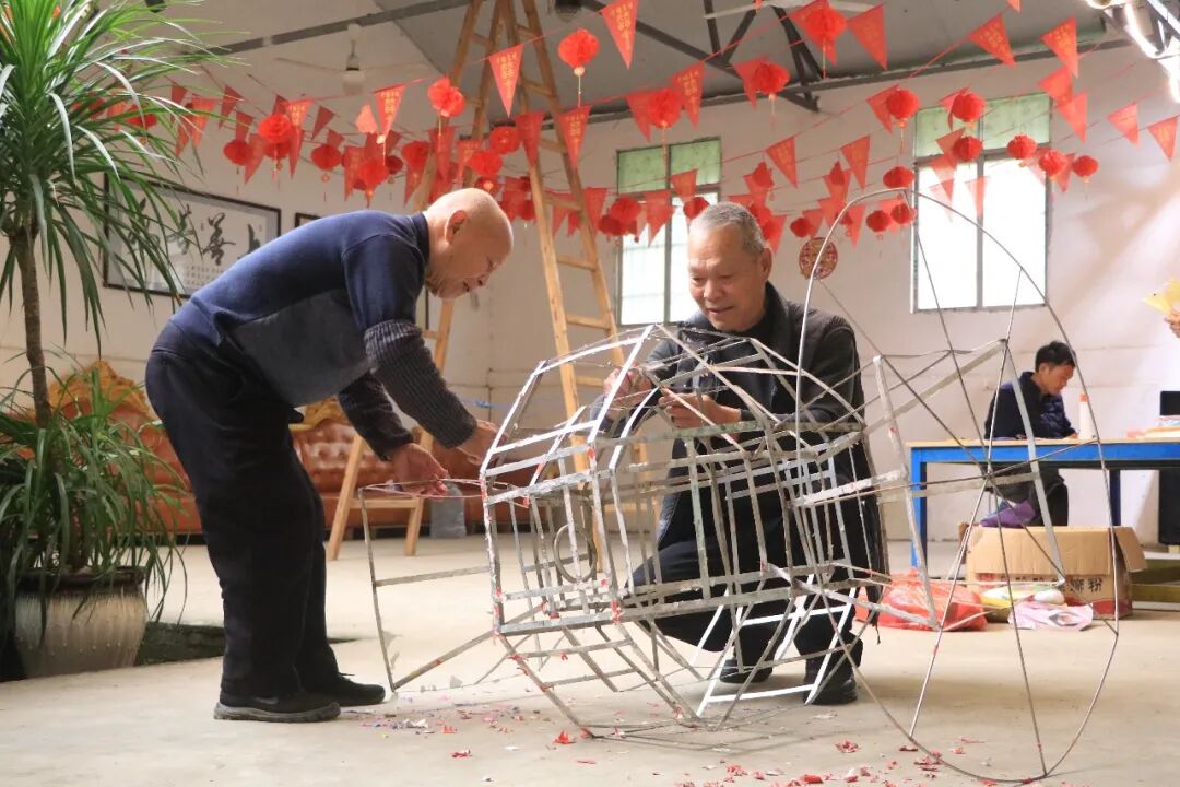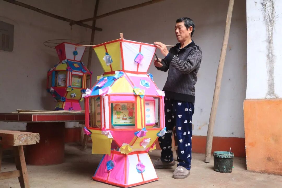制作现场,竹篾、彩纸、丝线、浆糊等材料整齐摆放、一应俱全,村民们凝神专注,从削篾、扎架、糊纸到串饰,循着传统工序,精心制作每一盏花灯。花灯以竹为骨、以纸为衣,灯体内外层次分明、色彩鲜亮,灯裙雅致绚丽,独具客家风情。