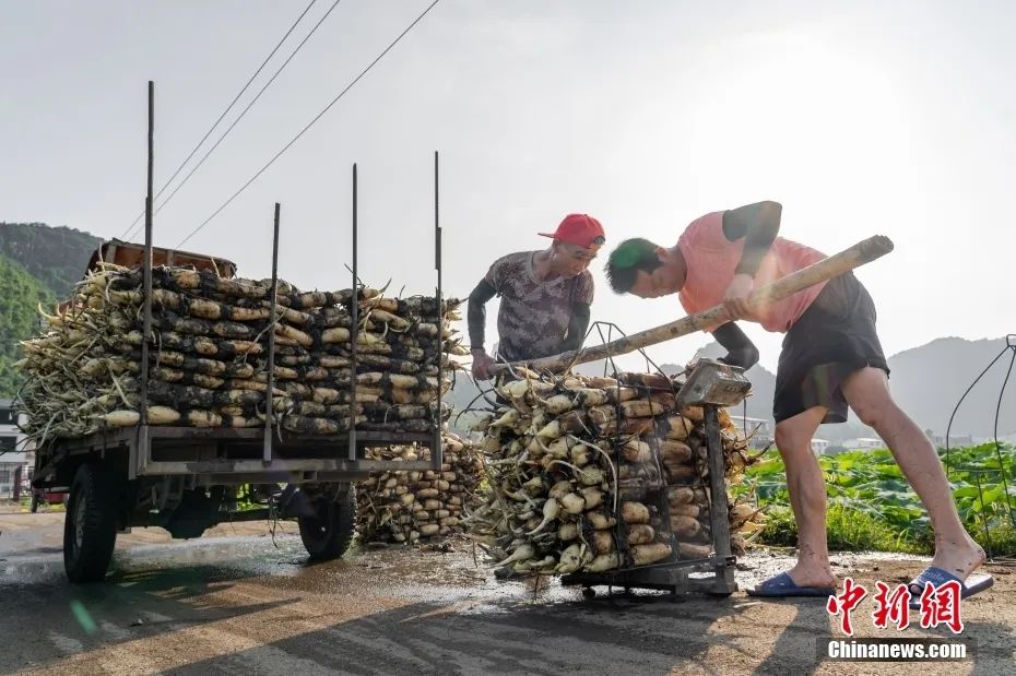 广西柳州,当地农民在清洗莲藕。