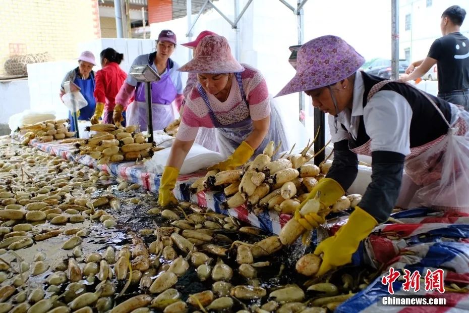 广西柳州市柳江区百朋镇,莲藕加工厂的工人在清洗莲藕。