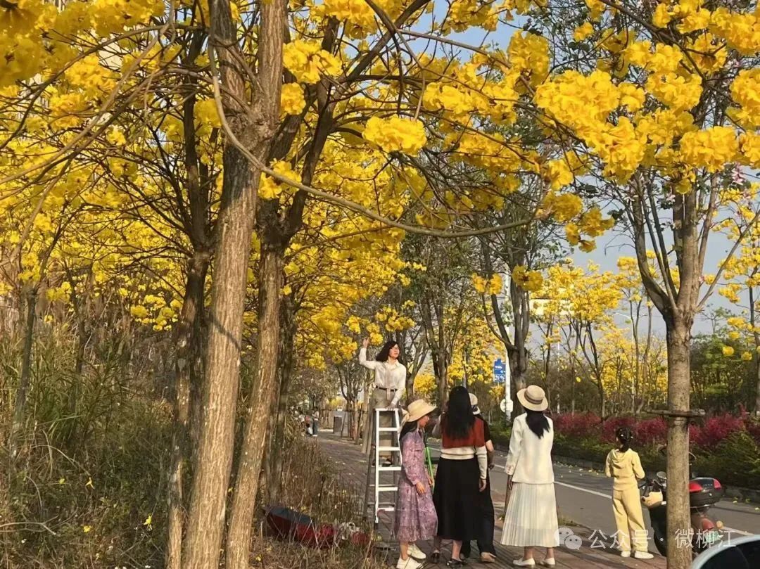 黄花风铃木的绽放不仅为市民们带来了视觉上的享受,也为柳江旅游业注入了新的活力。许多外地游客慕名而来,只为一睹这难得一见的金黄色花海。他们在这里拍照留念、品尝当地美食、感受浓郁文旅风情,为柳江经济发展增添了新的动力。