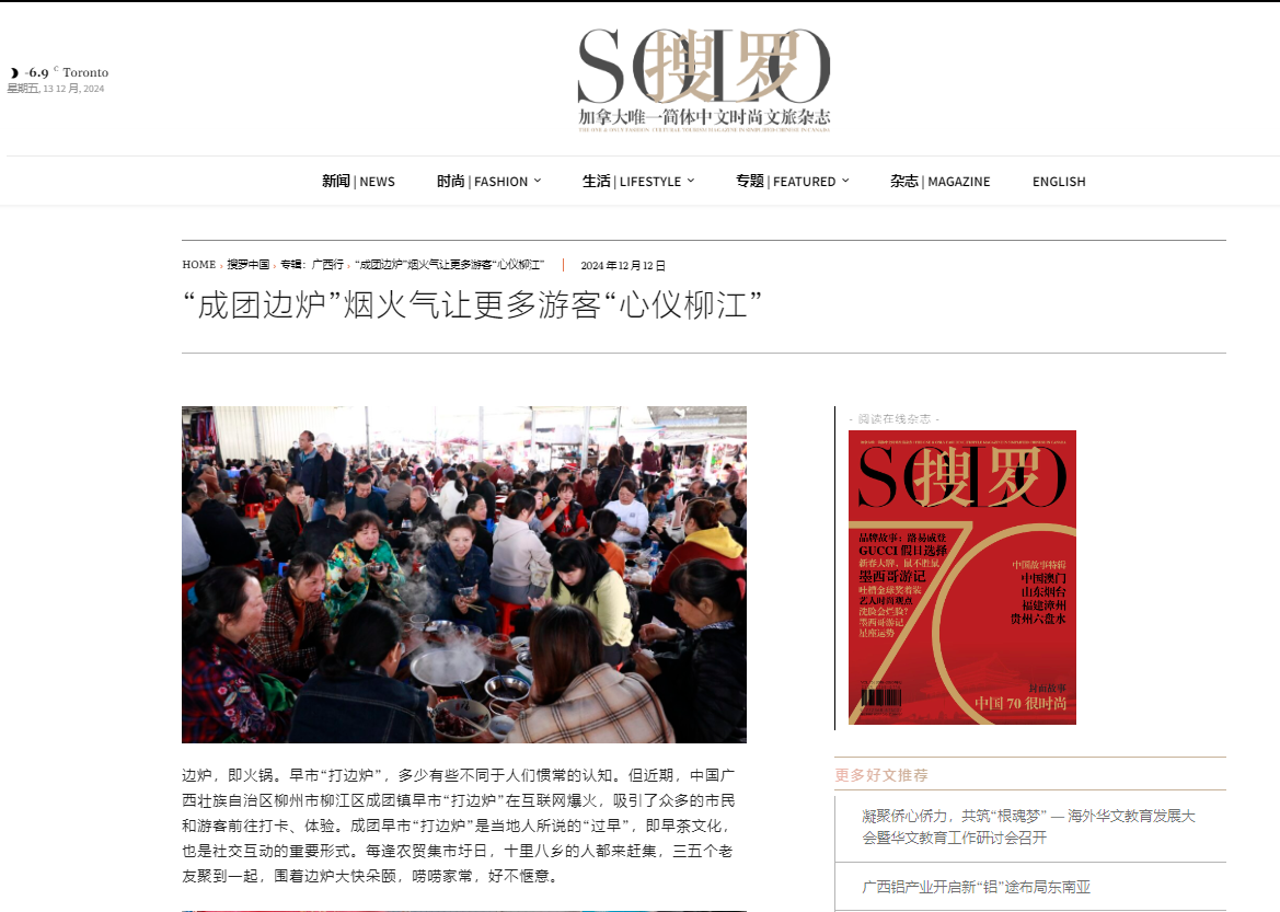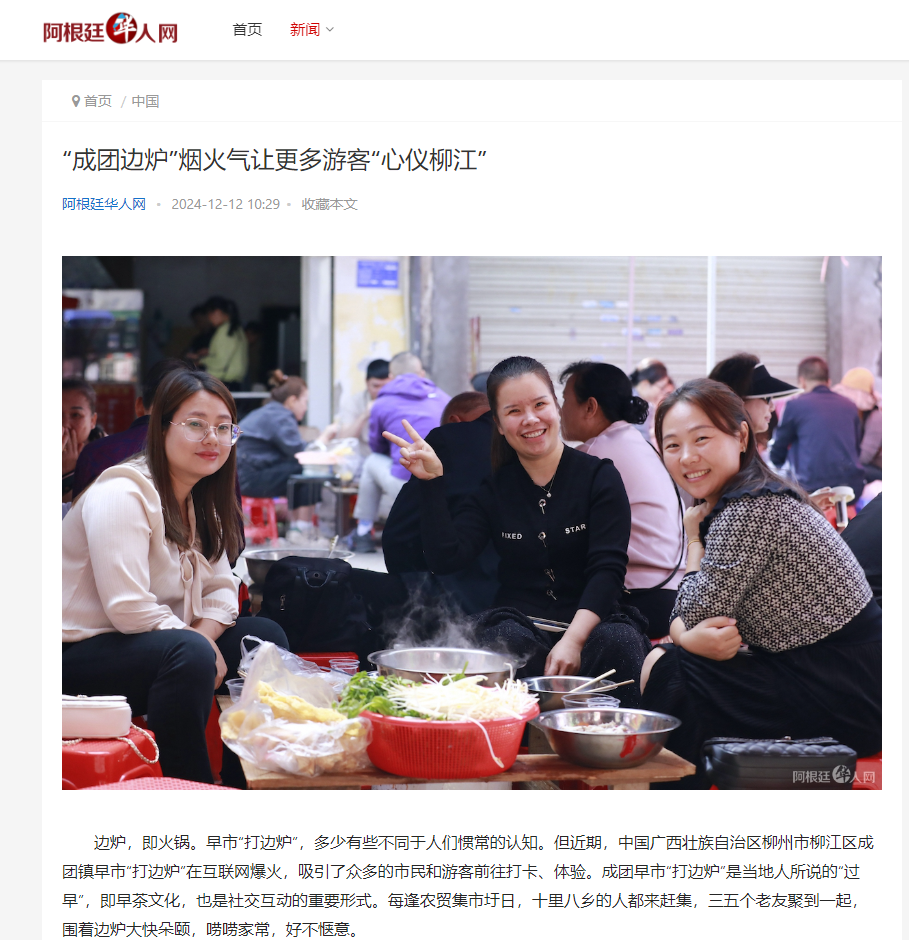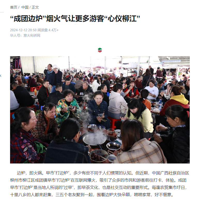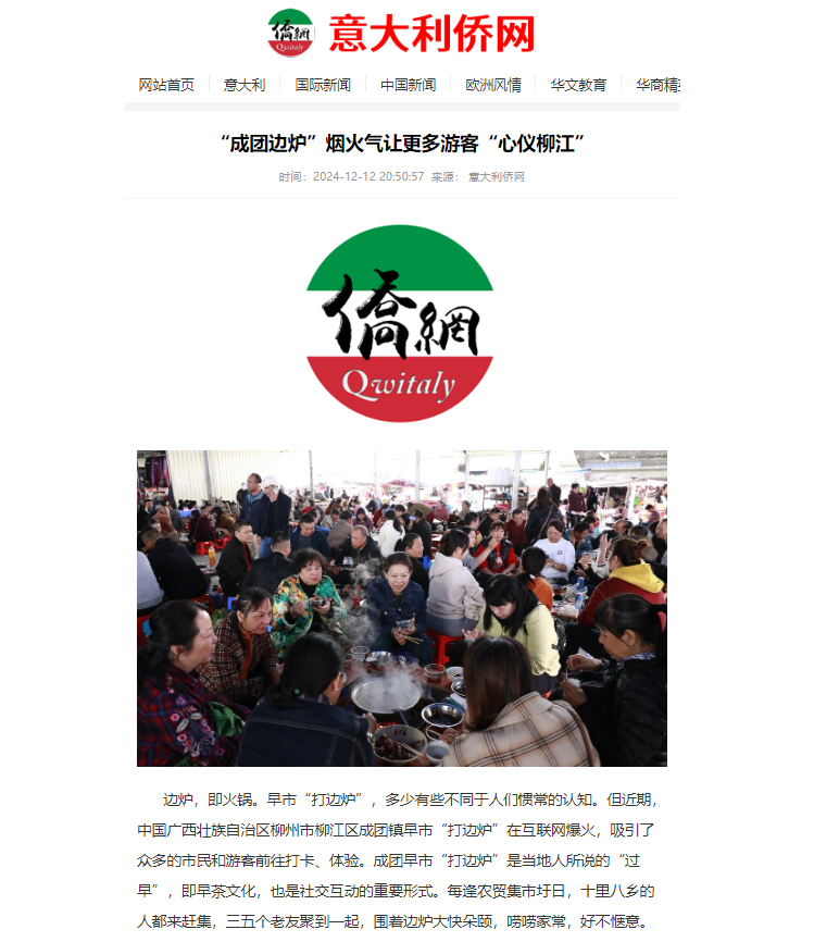 12月12日,意大利侨网、华人头条、加拿大《搜罗杂志》、阿根廷华人网刊发题为《“成团边炉”烟火气让更多游客“心仪柳江”》文章,聚焦成团早市“打边炉”爆火现状,探寻小小边炉所承载“烟火气”背后的故事,呈现柳江淳朴的民风和热情好客的品质。