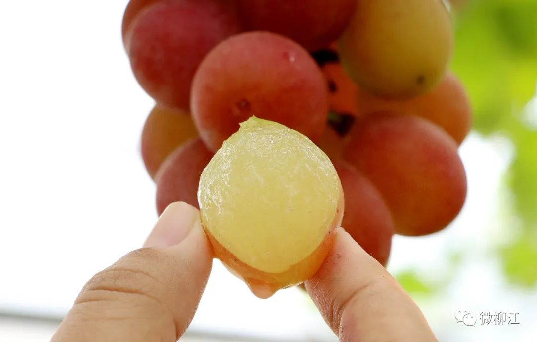 在葡萄藤下,晋航农业生态园经理杨向连正在对妮娜皇后葡萄进行品鉴,确保葡萄上市的质量和品相。“妮娜皇后葡萄是从日本引进的葡萄新品种,成熟的葡萄颗粒均匀、个头大,甜度高达25-27度。”杨向连一边剪下一串成熟的葡萄一边告诉记者,妮娜皇后葡萄果皮薄、果肉紧实,果串均重约六两,吃起来清脆可口,既有浓郁的牛奶味又有香甜的草莓味。